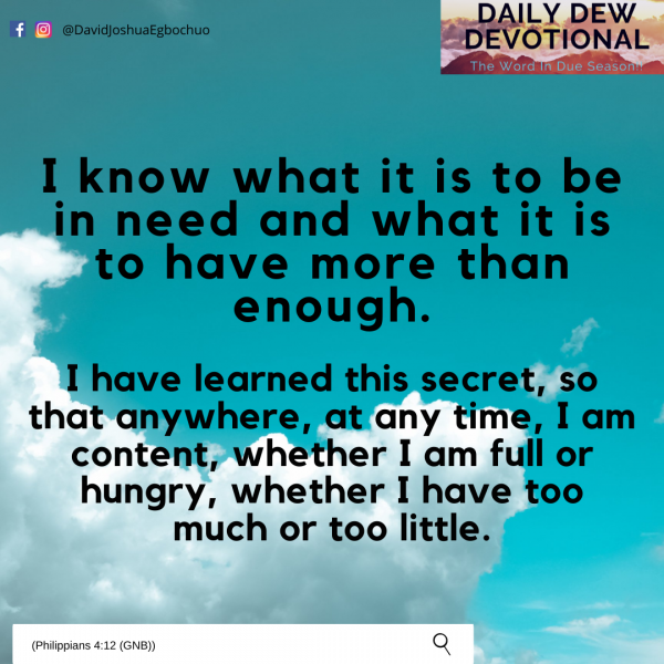 *I know what it is to be in need and what it is to have more than enough. I have learned this secret, so that anywhere, at any time, I am content, whether I am full or hungry, whether I have too much or too little.*