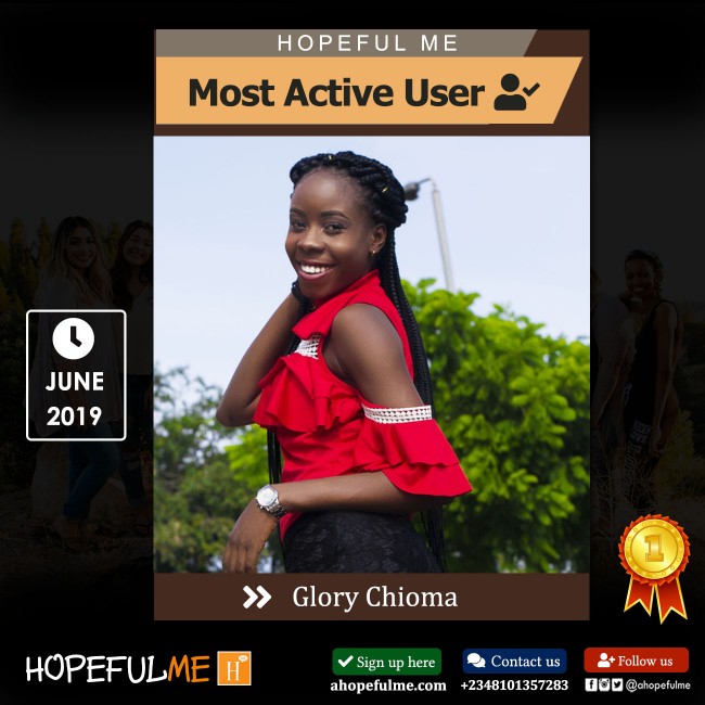 Our Most Active User for the month of June, 2019 goes to Glory Chioma ( @Glory2019 ) 😊.