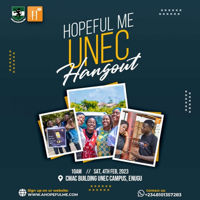 HOPEFUL ME first hangout for the year is taking place this Saturday at University of Nigeria Enugu Campus (UNEC).π₯Ίπ₯Ίβ€οΈ